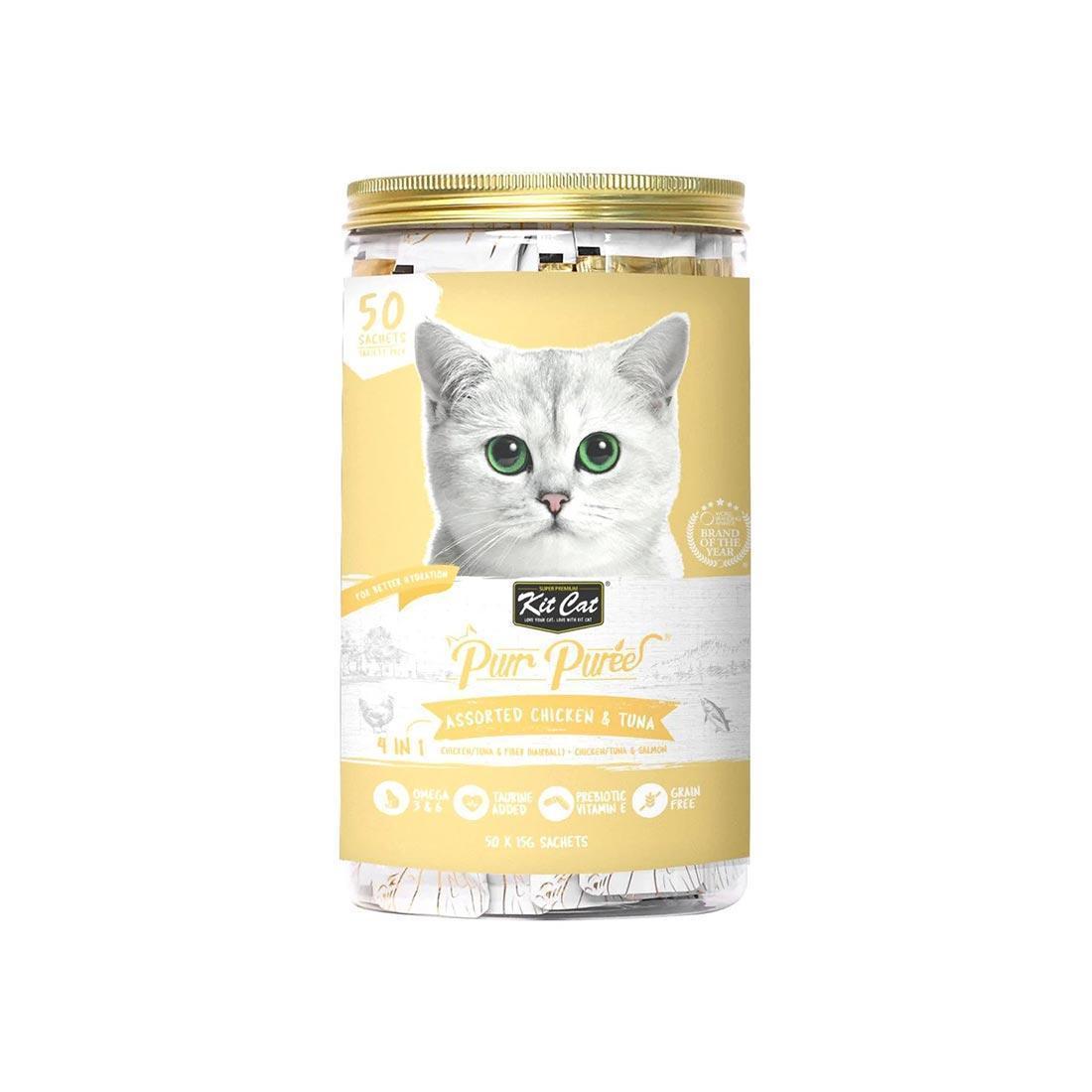 Rewarding your cats has never been more delicious with Kit Cat Purr Puree Variety Pack. Featuring a rich and hydrating treat that is loaded with natural delicious goodness, get ready to have your kitty friends purring for more! Each pack is loaded with functional nutrient to bring your pets a wholesome and refreshing experience from our grain-free recipe.