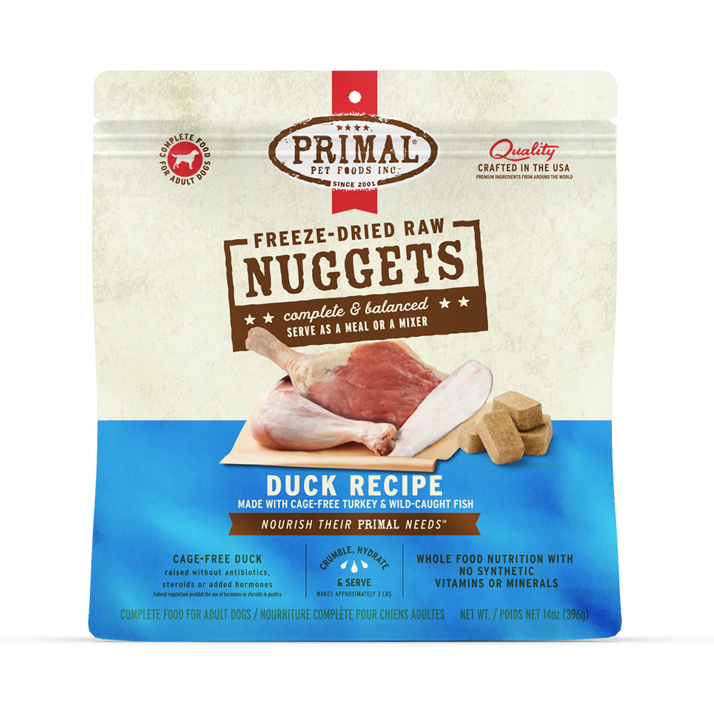 Keep your pet in their prime with high-quality freeze-dried raw recipes crafted with real, whole foods that deliver optimal nutrition and digestibility. Primal Pet Foods has pioneered raw nutrition for over 20 years and we remain steadfast in our mission to honor pets’ ancestral, biological needs. Primal Freeze-Dried Raw Nuggets are shelf stable and easy to use, so you can nourish your dog with the nutrition they deserve in a safe and convenient format.