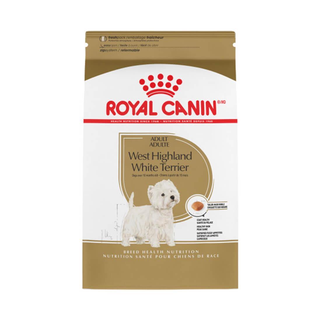 Royal Canin West Highland White Terrier dog food is tailor-made nutrition created just for your pure breed Westie. This exclusive breed-specific diet is uniquely formulated for your West Highland Terrier with specific nutrients to help them thrive. The unique kibble shape and texture are specially designed for your Westie’s blunt, gradually tapering muzzle and large teeth, making it easy for them to pick up and chew. Exclusive nutrients reinforce the skin barrier to help protect their delicate skin and maintain a gleaming white, short coat. And a combination of exceptional aromas and flavors is sure to please even a picky eater.